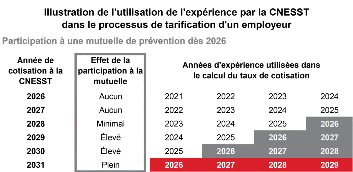 L’adhésion à une mutuelle de prévention aura un effet sur votre cotisation à la CNESST quelques années après le début de votre participation. Par exemple, comme illustré dans le tableau ci-dessous, si vous joignez une mutuelle au 1er janvier 2026, vous commencerez à bénéficier de l’effet de cette mutuelle à compter de 2028 seulement et vous atteindrez le plein effet en 2031. Ce n’est qu’à ce moment que l’effet de la mutuelle sera complet et que vous profiterez de toutes les économies.